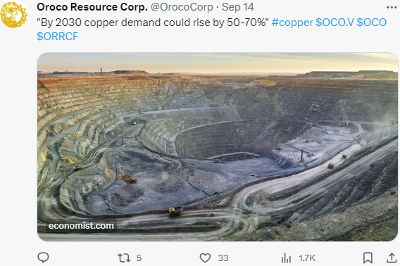 On October 18, 2023, following release of the PEA by Oroco, Holdco raised their 12-month target price to C$2.15 per share, in part based upon a Long Term copper price assumption of $4.35/lb. The full note can be found HERE.